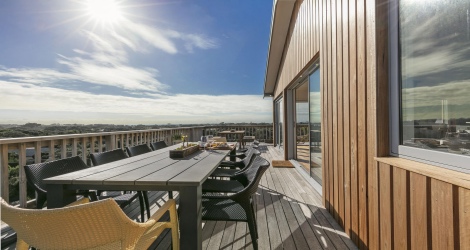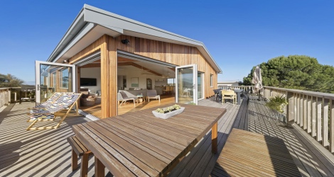 Start your hygge-laced hideaway stashing your bags in your pick of the three bedrooms (one downstairs, two upstairs). A wood-burning pot belly stove in the living area can be sparked in winter, or push back the sliding doors to connect the upper floor with the generous wraparound balcony and watch the sunset.